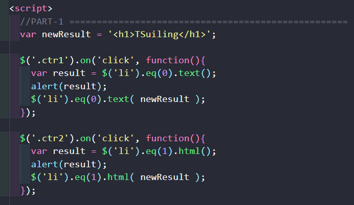 <button class="ctr1">1. 以 text 方法取得 list1 原有內容,再寫入"<h1>TSuiling</h1>"</button>