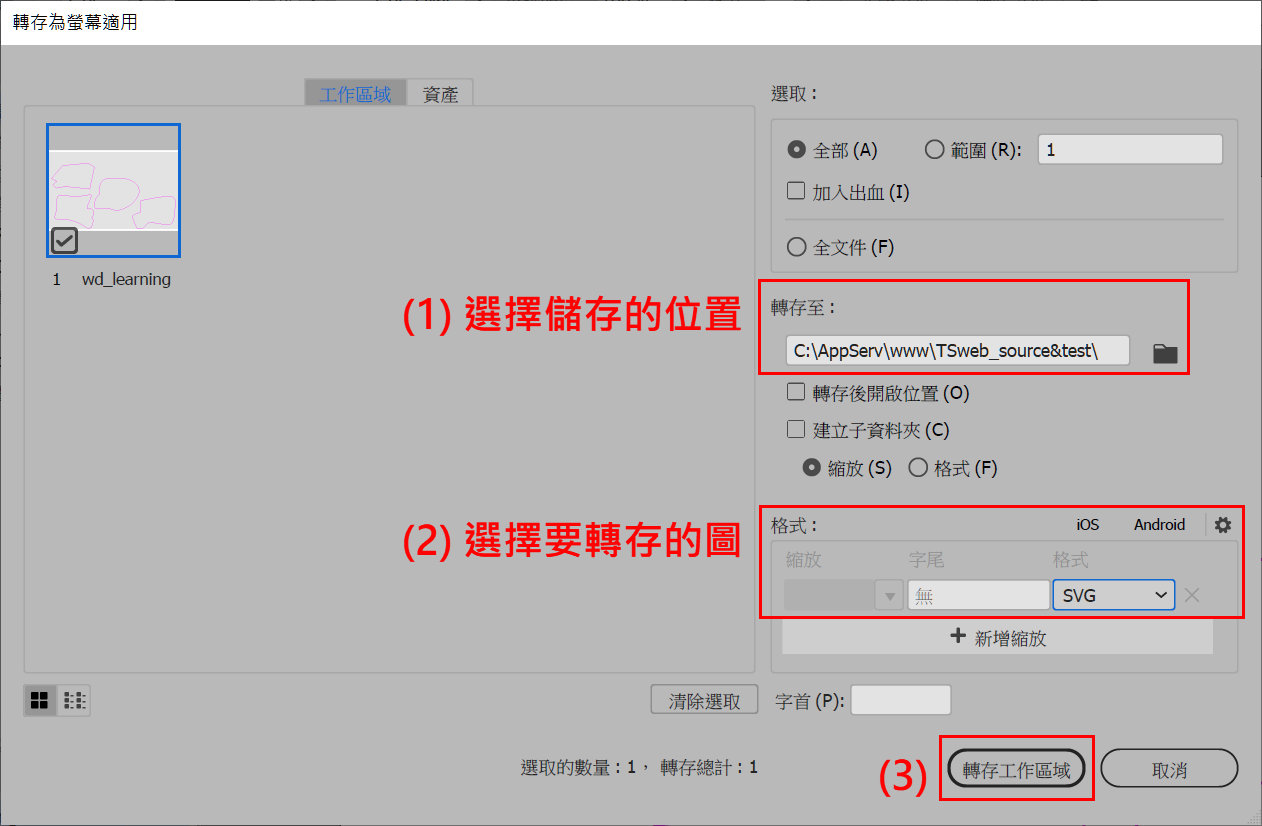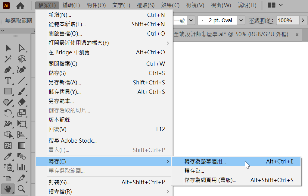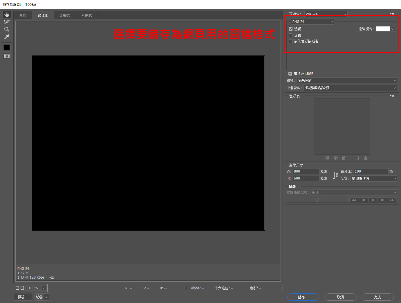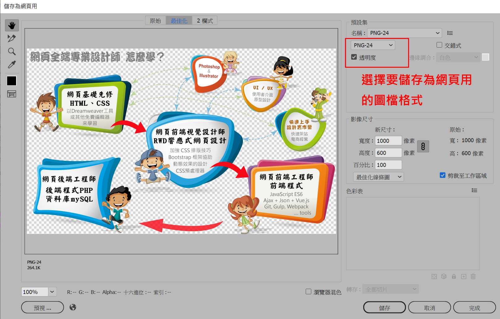 如果只是 jpg、png 的出圖,也可以選擇「檔案 > 轉存 > 儲存為網頁用 (舊版)...」