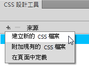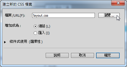 開新檔案, 建立新的CSS檔案, 儲存檔案, 檔案名稱「layout.css」