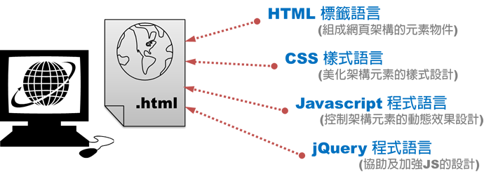 - HTML 是一種標籤式的描述語言,目的是設計瀏覽器顯示的網頁。