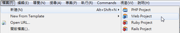 點選上方文字選單的「檔案」→「新建」→「Web Project」