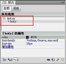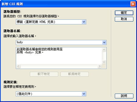 運用CSS樣式面板==>新增CSS規則==>如下圖所示, 將規則定在在此文件
