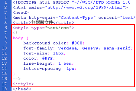 則CSS樣式規則的語法寫在本文件的<head></head>區之內