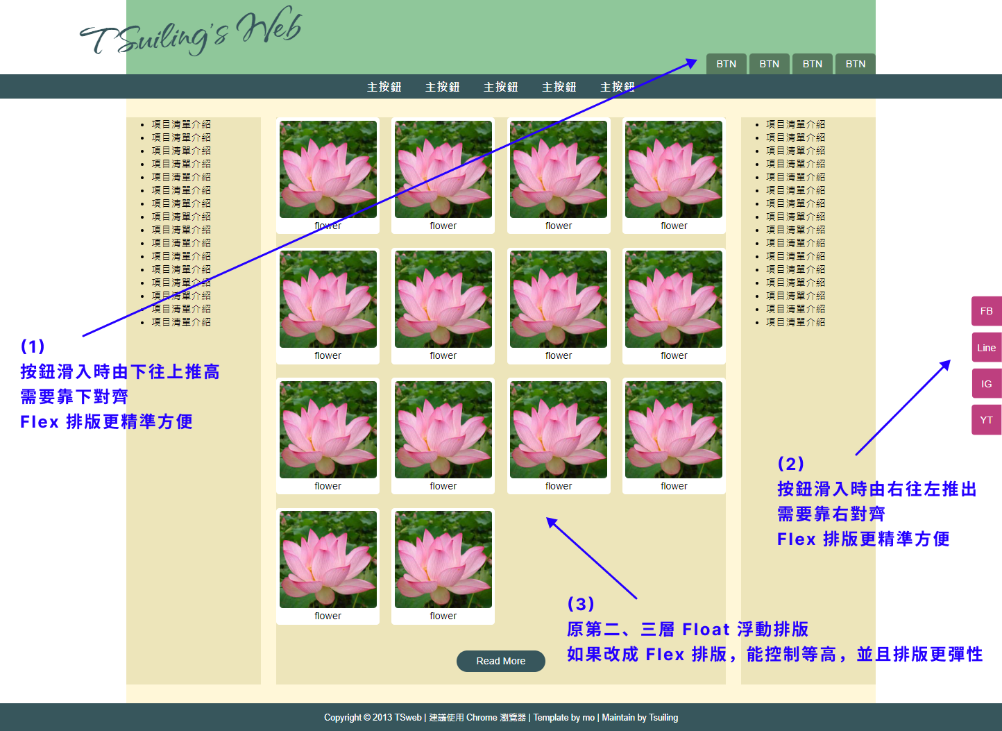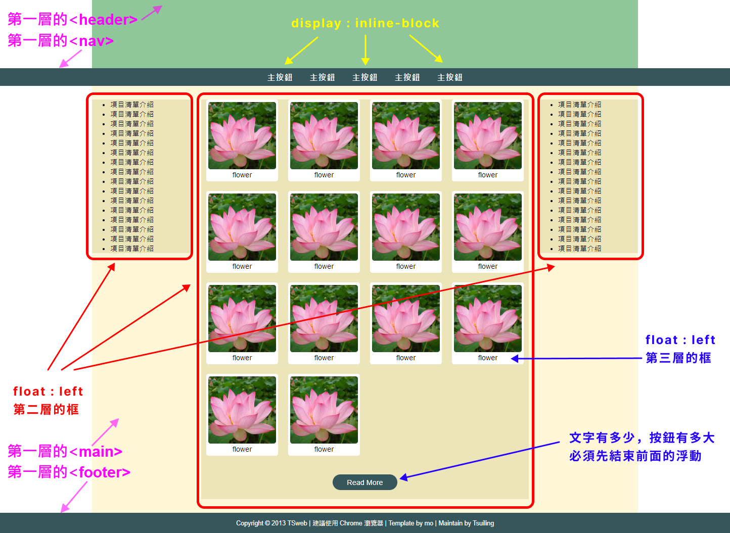- 網頁的設計:先設計好區塊式的框架 > 接著再擺放圖文內容。