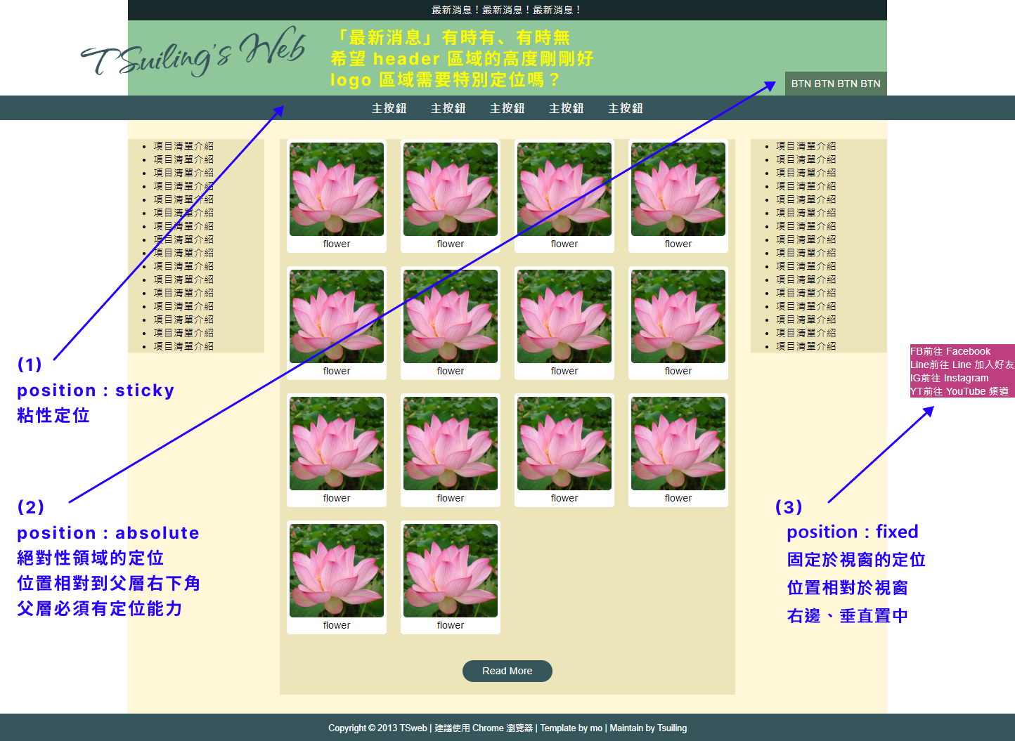 - 當物件需要固定在視窗中,希望不因捲動畫面而被移動,設定為 固定性定位 fixed。