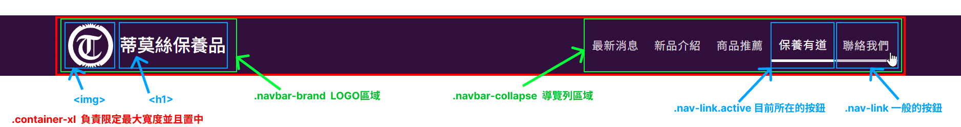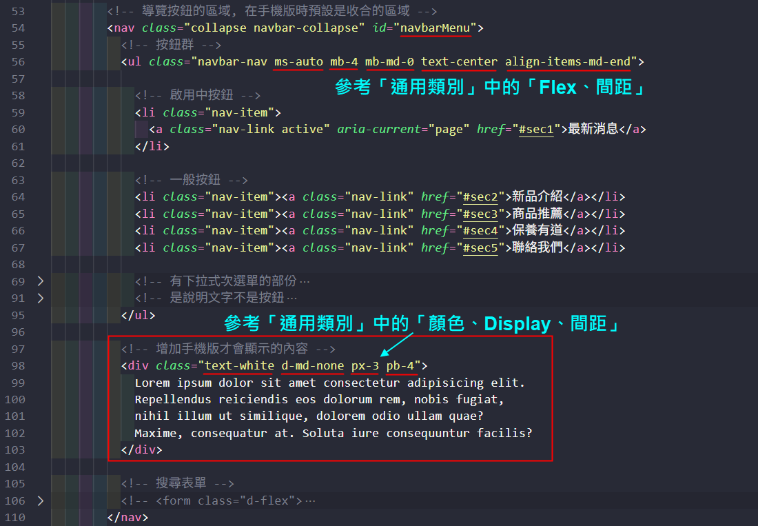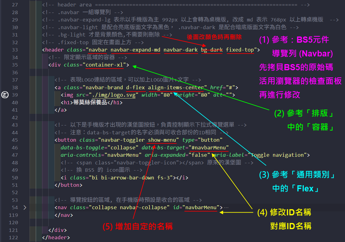 資料參考:導覽列 (Navbar) Bootstrap說明網站(中) 、 w3schools(英) 、 RUNOOB(中)
