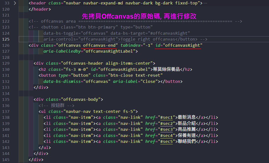 index.html 加上 Offcanvas 再 "參考" 以下圖示進行修改設計