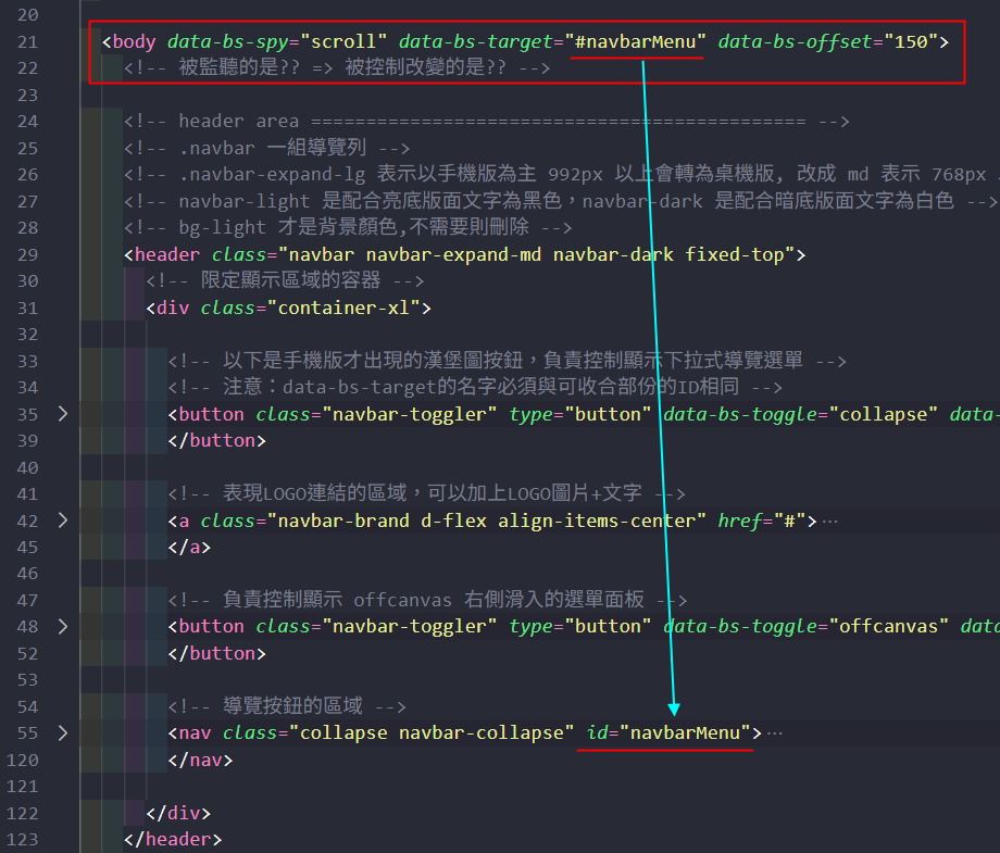 資料參考:滑動監聽=>導覽按鈕對應呈現 Bootstrap說明網站(中) 、 w3schools(英) 、 RUNOOB(中)