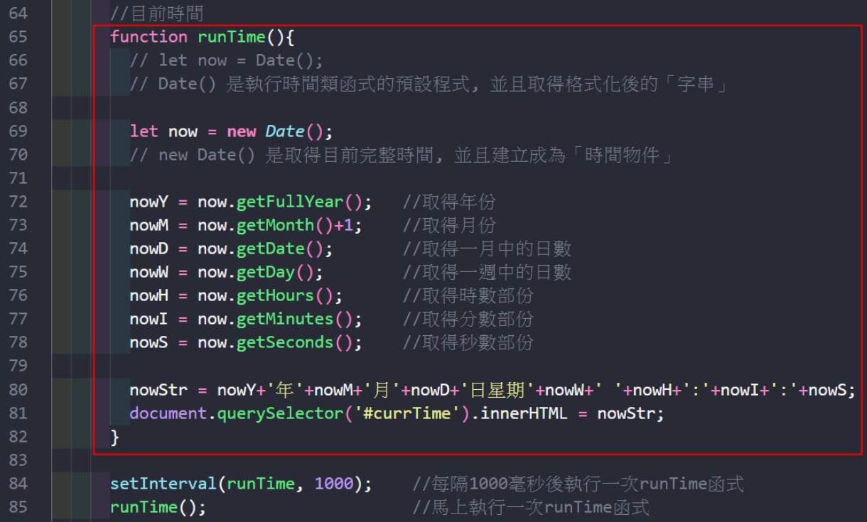 常搭配 setInterval() 或 setTimeout() 函式重複呼叫執行 function。