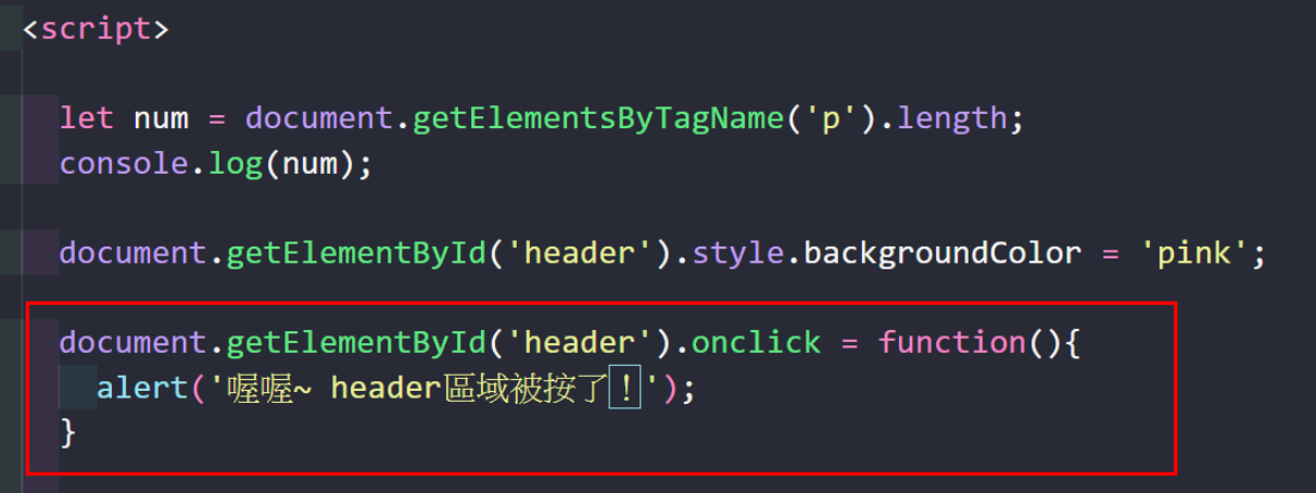 object.event = function(){ ... }; 物件.事件=當事件發生時執行的工作寫在function函式中