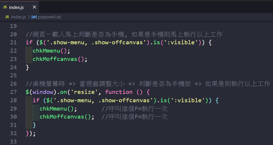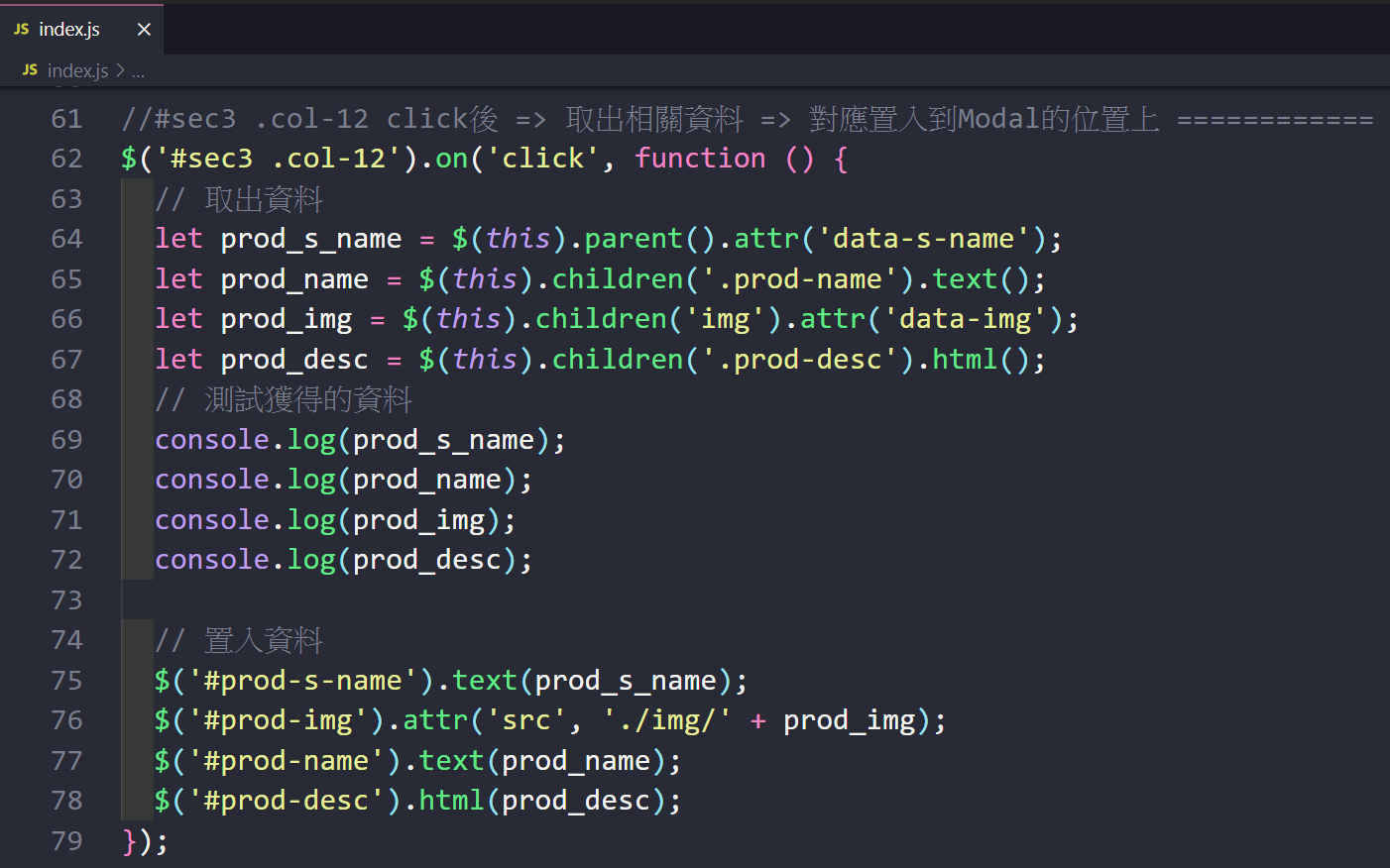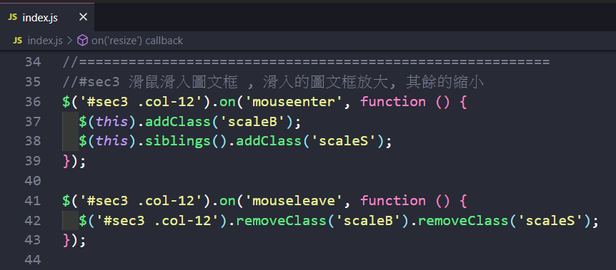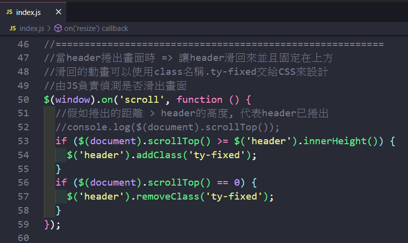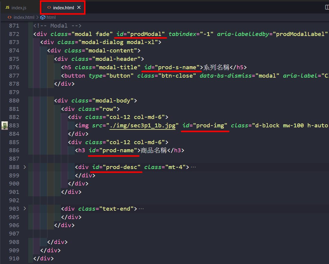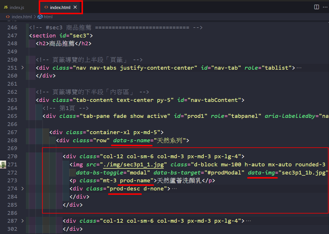 回到「TS_web5_Timothy_Care」網站的「index.html」檔案,設計相關需要的 JS 程式