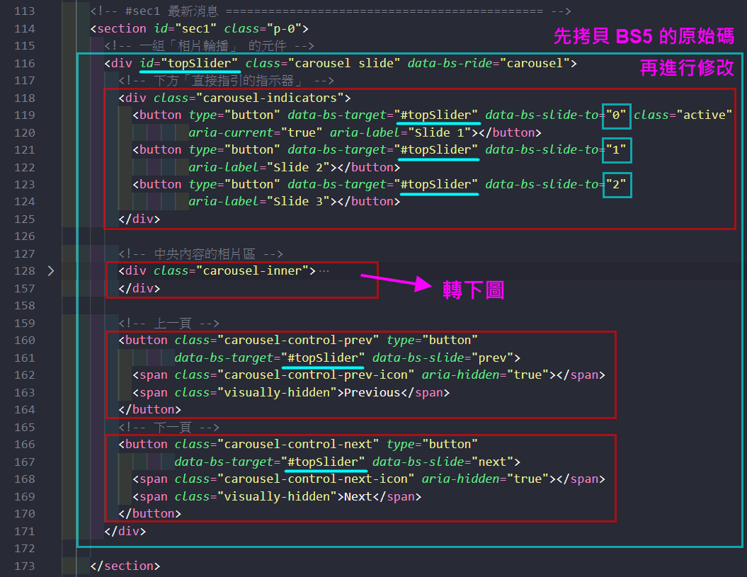 index.html 加上輪播設計 (Carousel) 再 "參考" 以下圖示進行修改設計