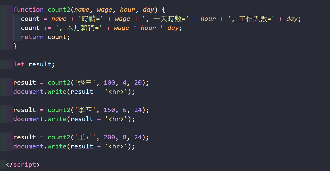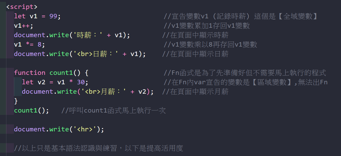 當工作預想會執行但不是馬上執行的程式,撰寫包在 function 的 { } 內,需要執行時再呼叫 function 執行。