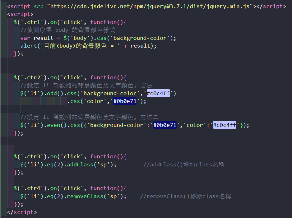<button class="ctr1">1. 偵測取得目前 body 的背景顏色</button>