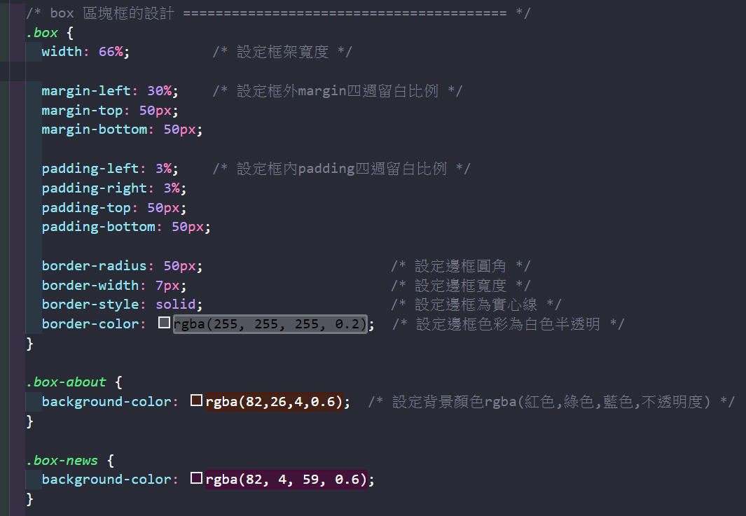 設計 CSS 樣式 (以下的CSS設定皆撰寫在 <style> ...... </style> 之中