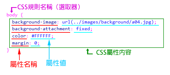 - 「選取器」是 CSS 樣式規則的規則名稱,也就是選擇來設計的物件。