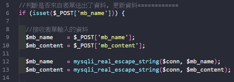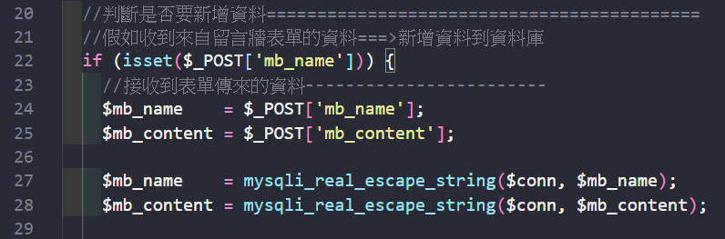 mysqli_real_escape_string( 連接資料庫 , 將帶入資料庫的資料 );