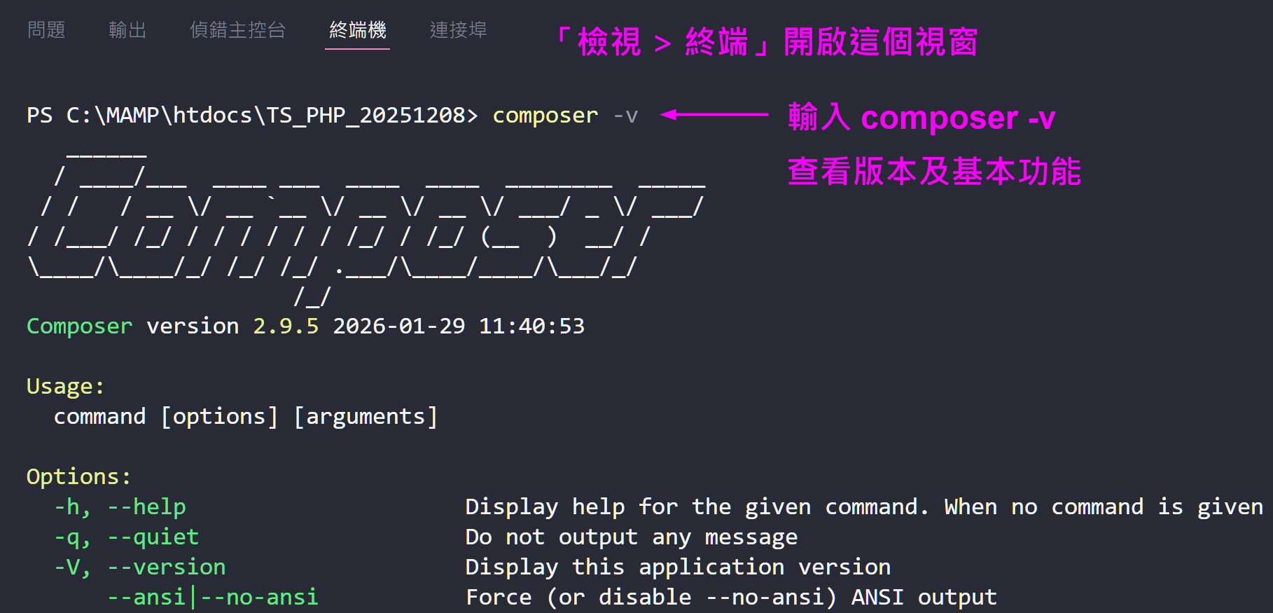 2. 在 VSCode 編輯器中開啟好專案資料夾, 開啟終端機再安裝 PHPMailer