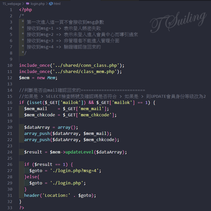 (3) 當收到確認信並點選連結回網站後, 在 login.php 進行會員身份等級的改變