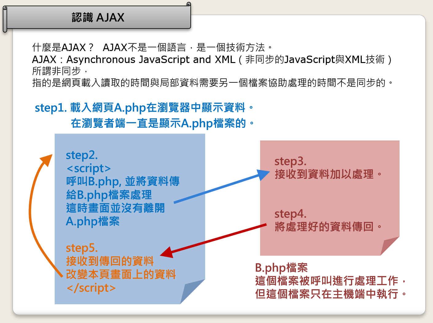 $(function(){ //當#showClassNews按鈕被點選時================== $('#showClassNews').click(function(){ //運用ajax技術 $.ajax({ //呼叫 admin_news_class_show.php 協助處理,負責查詢出資料 url:'./admin_news_class_show.php' //當完成 admin_news_class_show.php 檔案的工作之後 //繼續進行以下function //變數result負責接收 admin_news_class_show.php 回傳的資料 }).done(function(result){ //將接收到的資訊,顯示到.class_news_list這個區塊之內 $('.class_news_list').html(result); }); //完成以上之後,顯示出#newsClassArea這個區塊 $('#newsClassArea').show(); }); });